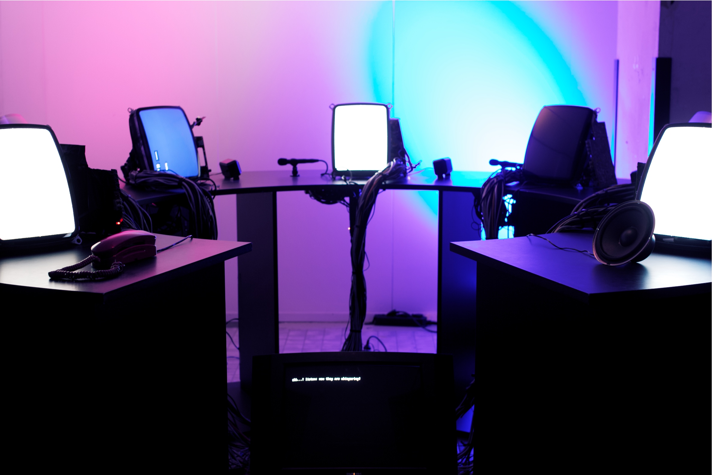 In 2017 for STRP Festival, I created Digital Whispers, an interactive installation that sets seven computers and one human into a game of Chinese whispers. Machine ears and robot voices pass on messages between themselves. Like the original game, inevitable errors occur, creating word-chimeras and resulting in absurd sentences only a robot could have created. The final phrase spoken back to the visitor, often with surreal overtones, leaves viewers to question the machine as a reflection of humanity.